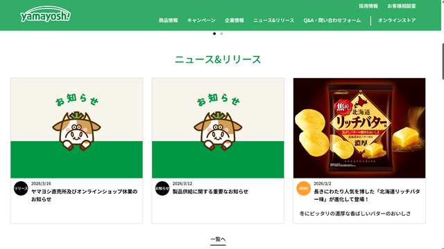 山芳製菓は「製品供給に関する重要なお知らせ」と題し、「平素より山芳製菓製品をご愛顧いただき、誠にありがとうございます。現在、国際情勢の影響によりホルムズ海峡が封鎖され、弊社が製造工程で使用している重油の調達が極めて困難な状況となっております」と報告。
