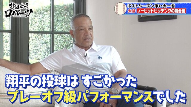 9月17日のフィリーズ戦で5回ノーヒットの快投を見せた大谷翔平について、ロバーツ監督は「翔平の投球はすごかった。プレーオフ級パフォーマンスでした」と賛辞。6回以降の続投を見送った理由については「翔平が先発する時は毎回イニング数を厳しく設定しているから、本当は次の回まで投げてもらいたかったが計画を急に変えるのは翔平に対してフェアではない」と説明した。