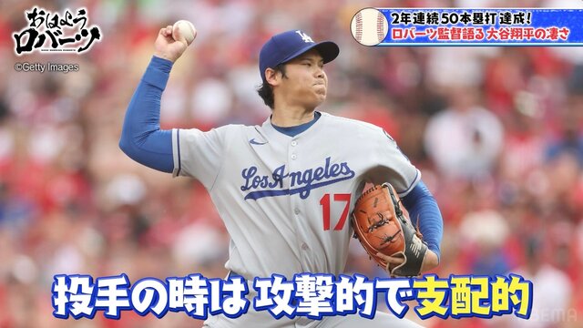 大谷選手がメジャー6人目となる2年連続50本塁打を達成したことについて、ロバーツ監督は「今年は投手をやりながら、打者としても昨年と同じような成績を残したのは素晴らしい」と称賛。「打者と投手では考え方が違うと思う。翔平も投手と打者では違う人格を持っている」と話した。