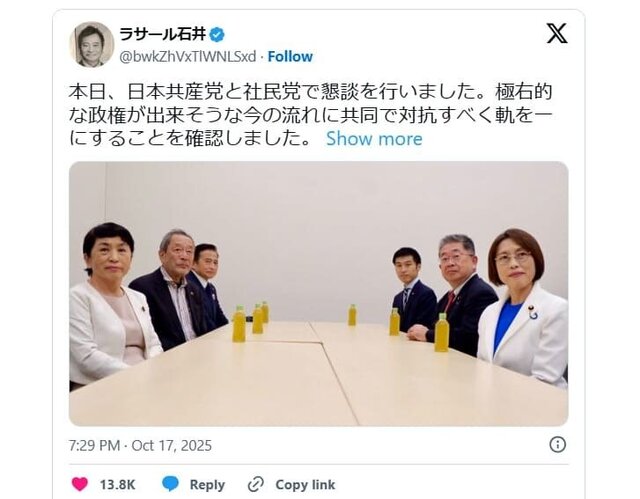 社民党のラサール石井参院議員が17日、自身のX(旧Twitter)を更新し、日本共産党と社会民主党との懇談を行ったことを報告した。