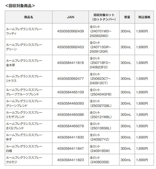 対象となるのは、以下の「ルームフレグランススプレー」11種類(各300mL、税込1,690円)。すべてのロットが回収対象となる。