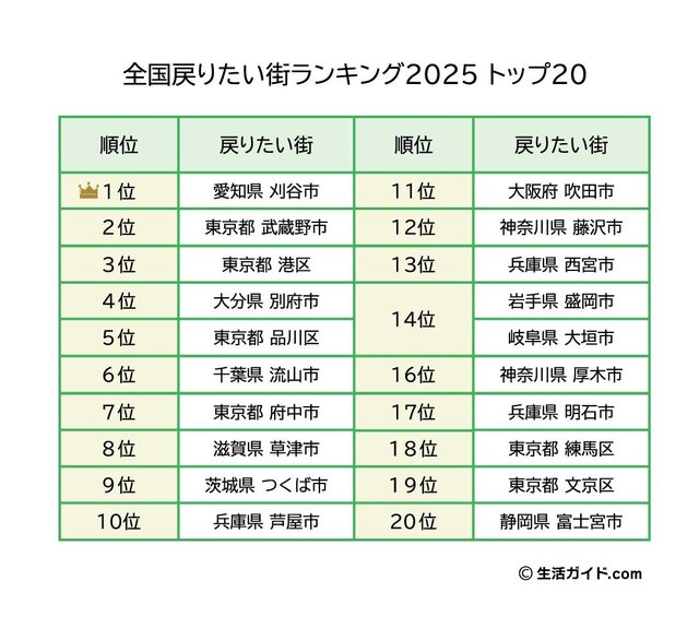 株式会社ウェイブダッシュが運営する地域応援サイト「生活ガイド.com」が19日、「全国戻りたい街ランキング2025」を発表した。