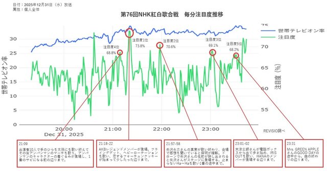 REVISIO株式会社は、2025年12月31日に放送されたNHK紅白歌合戦(第76回)について、視聴者がテレビ画面をどの程度注視していたかを示す「注目度」を分析し、結果を公表した。